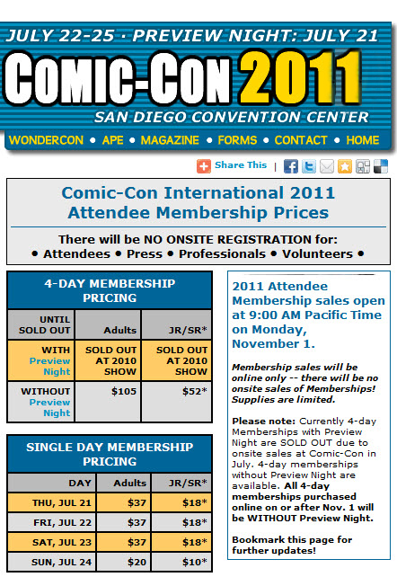 As in the past, no memberships will be sold onsite at Comic-Con and last years special passes with the Wed preview night were sold out.